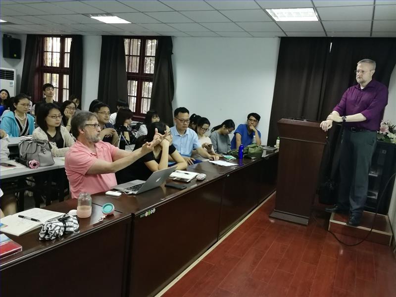 最后,Jeffrey Runner教授总结,一致性原则对代词和反身代词的前照应起指导作用,约束原则也会进一步促进代词和反身代词的回指解读。会后,徐老师和Michael K. Tanenhaus等多位师生就研究问题和范式与Jeffrey Runner展开了热烈的讨论。本次讲座的成功举办,为在座师生如何运用心理语言学范式研究进行回指解读提供了新的思路和启发。