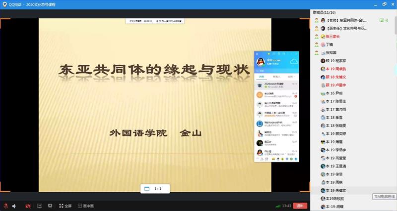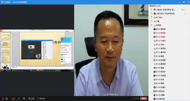 院长金山教授是本场讲座主讲嘉宾。金教授以“东亚共同体的缘起与现状”为题进行了精彩的演讲。QQ群中400多名南师大外院青年教师、本科生、硕博研究生准时上线,聆听了本场讲座。