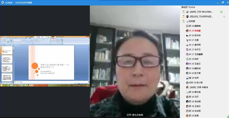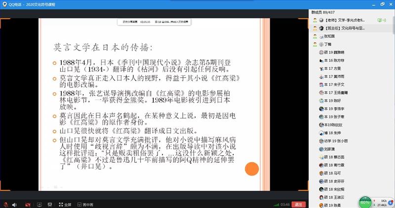 副院长王永祥教授主持的“文化符号与亚洲共同体”研究项目系列讲座第四讲在线上顺利召开。讲座于19:00在QQ群中正式展开。讲座由王永祥教授主持,山东师范大学的李光贞教授主讲,李老师进行了题为“中国当代文学在日本的传播----以莫言文学为中心”的精彩演讲。QQ群中400多名南师大外院青年教师、硕博研究生和本科生准时上线,一起聆听了这场精彩的讲座。