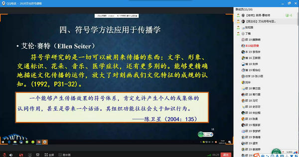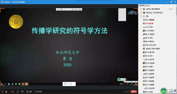 副院长王永祥教授主持的“文化符号与亚洲共同体”研究项目系列讲座第五讲在线上顺利召开。讲座于19:00在QQ群中正式展开。讲座由王永祥教授主持,西北师范大学的曹进教授主讲,曹教授的讲座题目是“传播学研究的符号学方法”。QQ群中400多名南师大外院青年教师、硕博研究生和本科生准时上线,一起聆听了这场精彩的讲座。