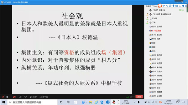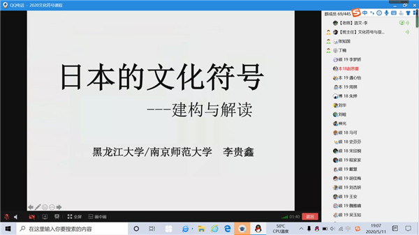副院长王永祥教授主持的“文化符号与亚洲共同体”研究项目系列讲座第八讲以在线形式顺利召开。此次讲座于19:00-21:00在QQ群举行,由王永祥教授主持,黑龙江大学李贵鑫副教授作为主讲嘉宾,以“日本的文化符号:建构与解读”为题进行了精彩演讲。QQ群中400多名南师大外院教师,本科生以及硕博研究生准时上线,聆听了本场讲座。