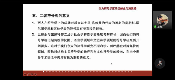 副院长王永祥教授主持的“文化符号与亚洲共同体”研究项目系列讲座第九讲在线上顺利召开。讲座于19:00在腾讯会议上正式展开。讲座由王永祥教授主持,广东外语外贸大学的萧净宇教授主讲,萧教授进行了题为“巴赫金与施佩特:符号学视角”的精彩演讲。会议群中400多名南师大外院青年教师、硕博研究生和本科生准时上线,一起聆听了这场精彩的讲座。