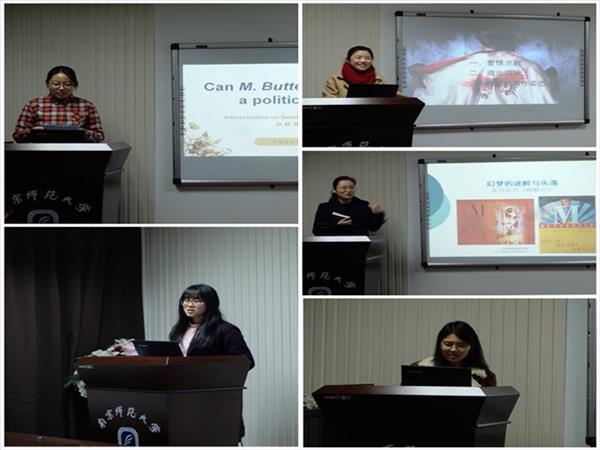 此次沙龙由三个环节组成,依次为分析戏剧《蝴蝶君》,问答互动和自由讨论。在第一个环节中,五位主讲人分别从《蝴蝶梦》是否是一部政治戏剧;其中幻梦的迷醉与失落;《蝴蝶君》中东西方文化的对立冲突关系;作品中的爱情悲剧、政治隐喻与作家的写作姿态;以及主人公伽里玛心理的渐变过程的角度对其进行解读。陈爱敏老师对此次活动中同学们的精彩表现给予了肯定,并就同学们的观点进行了点评。他提出“文学作品的研究主题应当具体化”;“研究者需加强理论深度,选用一个理论视角剖析作品”;“作品的解读框架要精巧化,逻辑化”。此外,陈老师肯定了本次沙龙活动思维碰撞的意义,并鼓励大家多参与此类性质的学术交流活动。在接下来的问答环节和自由讨论环节中,在座同学积极抢答题目并抒发了自己对于《蝴蝶君》的见解,陈爱敏老师也对同学们讨论的问题做了相应的解答。