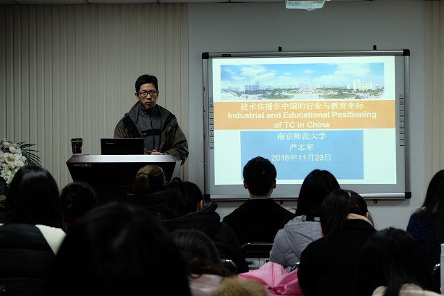 其次,他就语言服务行业与技术传播的关系进行了阐释。提出语言专业学习者在技术传播方向有着极大的优势,为我们提出了新的研究方向和就业方向。接着,他就技术传播在中国高校的存在与发展进行了进一步分析。通过分析某音箱说明书存在的错误让我们了解了产品与说明书质量存在不匹配情况,再次强调了技术传播学科的重要性。最后,严教授展示了一些照片,向我们展示了南师大在技术传播方面的努力。鼓励在座的研一新生可以多多学习技术传播学科的知识,为下学期技术传播课程及未来就业打好基础。
