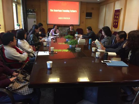 美国文明研究所在随园校区500号楼2楼会议室举办“The American Founding Fathers”读书报告会。王萍和张媛两位老师结合各自论文分别汇报了宪法起草者托马斯•杰弗逊和被遗忘的国父约翰•温斯罗普的生平事迹以及她们的研究心得。报告会由张瑞华老师主持,美国文明研究所全体成员、英语系、西语系、翻译系部分年轻教师和研究生同学参加研讨。