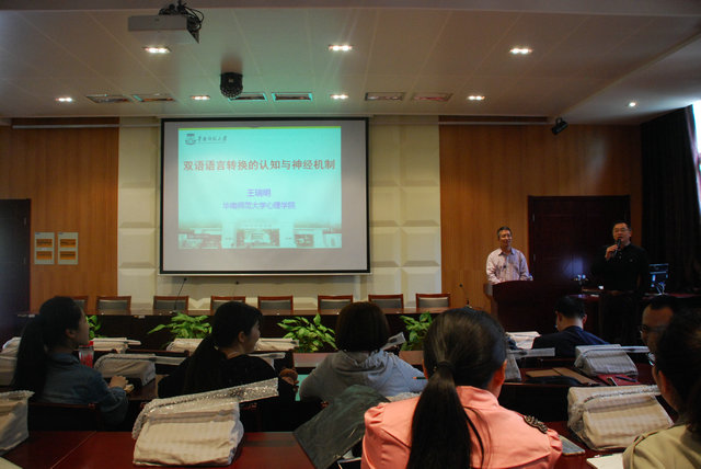 师生开展讲座,王教授结合语言学与心理学指出:“第二语言学习是心理语言学的重要领域,具有重要的理论价值和实践意义。”随后,刘教授介绍了他的几项发表在核心刊物的心理语言学实验。王教授首先介绍了使用跨长时重复启动范式探讨了中英双语者的双语记忆表征模型。接下来介绍了语言产生中非目标语言的加工机制。第三个实验有关语言理解中非目标语言的加工机制,主要研究了使用ERP技术探讨实验任务对语言理解中非目标语言加工的影响以及使用跨长时重复启动范式系统探讨语言理解中非目标语言的加工机制。第四个实验是语言转换对双语者语言与认知的影响,主要探讨的问题有认知控制能力和词汇通达能力对双语者Stroop效应的共同影响,熟练和非熟练中英双语者不同认知控制成分的系统比较以及不同认知控制成分的神经基础。王教授从研究范式,实验设计和实验结论等方面为在座师生进行了全面而深刻的讲解。