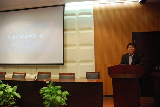 李建波教授以风趣的语言开始讲座。他通过介绍《外语研究》中的“外语研究应用价值探讨”专栏,表达了他对外语研究应用价值及其实践问题的关注,并对围绕此话题开展的一系列学术研讨进行了概述。随后,李建波教授由《大学英语教学指南》阐发,提出研究是教师发展的重要途径,并由此转向讲座主题,即外语研究误区问题。