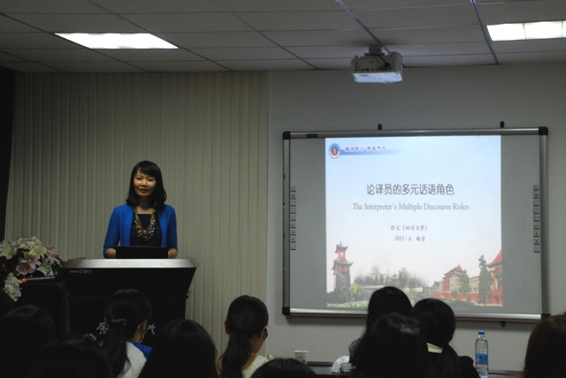 讲座开始之前,严志军副院长首先向同学们介绍了任文教授的履历。任文教授主要从事口译和公共演讲的研究和教学,担任过许多重要涉外活动的口译,有着丰富的口译实践经验。在讲座的一开始,任文教授首先结合一系列生动的图片向同学们展示了口译员们不为人知的工作状态:议员们的工作看似光鲜,实则辛苦,但同时也十分有意义,她以此鼓励同学们要克服困难,朝心中的目标努力。接着她谈到了口译研究的多重视角,包括认知语言学角度、社会语言学角度、语用学角度和传播学角度等。通过对各个研究视角的详细解释,她也提醒同学们可以从中选取一个作为学术论文的切入点。讲座的最后一部分,任文教授着重介绍了议员的多重话语角色。她介绍道,社会机构、雇主和议员自身对议员话语角色有着不同的定义,包括听话人、说话人和代言人,在很多情况下,议员的话语角色并不能始终保持一致,而是在各中角色之间转换。而对于在何种情况下应该扮演怎样的角色,任教授告诉同学们要审时度势、见机行事。