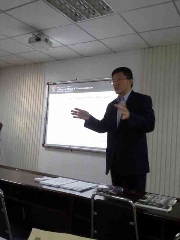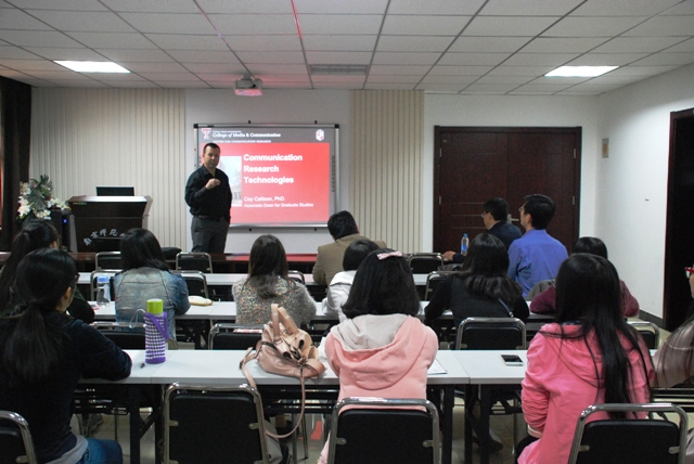 首先Coy Callison 教授对德州理工大学媒体和传播学院作了详尽介绍,并用专业的PPT和模拟动画向同学们展示了传播研究中心的大众传媒试验,其中包括读者测试、阅读内容分析、调查试验、读者眼神追踪,和精神心理学等,开阔了学生们的视野,加深了大家对媒体研究的认知。接着张威武教授就媒体传播和公共关系对社会资本的影响,作了精彩的学术报告,并简要介绍了德州理工大学媒体与传播学院科研小组。报告结束后的提问环节,同学们和教授们进行了更深层次的交流。针对有意向去德州理工大学读研究生和博士的同学们提出的问题,两位教授均耐心作出解答。比如有同学问:“作为英语专业的学生,去美国读传媒专业做实验,会不会太缺乏理科知识而学习困难,比如计算机和数学知识等”。而Coy Callison 教授则表示:媒体与传播学院的各专业要招收的并不是高级工程师,去国外读新传,英语水平高则更加重要。还有学生问到了奖学金和GRE考试等问题。