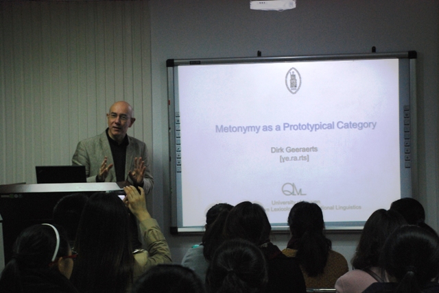 在本讲座中,基拉兹教授采用认知语义学中的原型理论,对于语言学界争论不休的隐喻和转喻的关系进行了探索。他回顾了传统的对于隐喻和转喻的定义,隐喻是基于相似性的语义转移,而转喻是基于临近性的语义转移,又进一步回顾了当代认知语言学界基于域的隐喻和转喻的定义,隐喻是跨域之间的语义转移,而转喻则是同一个域内的语义转移,分别分析了其优缺点,针对有些转喻不能使用这些传统方法和当代方法来研究的现象,使用了原型理论来探索。对于转喻的诸多现象,他采用了有界与无解两个横向维度,空间、时间、行为/事件/过程和组装/集合四个纵向维度,对于部分-整体、包含、接触和临近四个现象进行研究,得出了转喻的原型是物质的部分-整体关系这个结论。