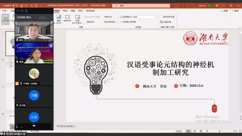 湖南大学的曾涛教授作了题为“汉语受事论元结构的神经机制加工研究”的主旨发言。曾涛教授从研究背景引入,提出句法分析不一定优先于语义信息的整合研究问题,介绍了实验的研究方法,展示了实验结果,通过分析P600和N400实验数值发现,句法加工并不总是优于语义加工,词汇语义整合在汉语句子理解中发挥着比句法结构分析更为重要的作用。
