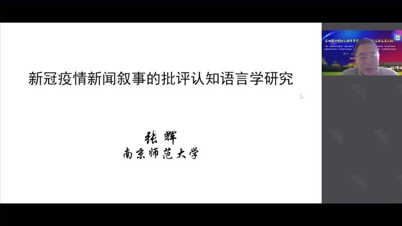 南京师范大学的张辉教授作了题为“新冠疫情新闻叙事的批评认知语言学研究”的主旨发言。对比介绍了中英文新闻叙事中的心理空间建构。张辉教授基于新冠疫情的新闻叙事报道,首次使用心理空间和概念整合理论对中文新闻叙事进行话语分析,对比了中美新闻叙事新冠疫情报道中在心理空间的内嵌和整合上的区别。
