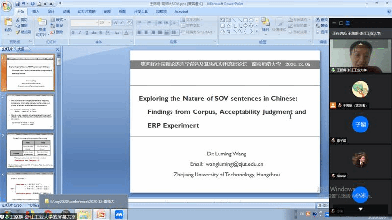 浙江工业大学的王路明副教授作了题为“话题和对比语境下的SOV语序加工:语料库、可接受度调查以及脑电实验发现”的主旨发言。她关注汉语句子中的线性序列在时间轴上是如何展开的等问题。王路明副教授介绍了为解决这一问题所进行的脑电实验和实验发现,分析了实验结果,对我们有很大启发。