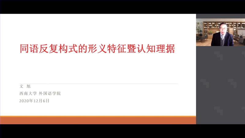西南大学的文旭教授作了题为“同语反复构式的形义特征及认知理据”的主旨发言。文旭教授首先阐述了同义反复构式的概念,接着提到了“名词是名词”构式这一典型形式。从语义角度进行研究。在产生的认知理据方面,构式的理解需要依赖语境。文旭教授提出,同语反复构式用构式语法的观点来分析才能更加完善。