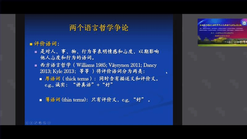 电子科技大学的王爱华教授作了题为“汉语‘仁’类二字描述语词的评价义生成的认知理据”的主旨发言。王爱华教授从两个争论引入。她提出了三种汉语“仁”类二字描述评价语词的构式,描述义类型、评价义类型和评价义生成的认知理据以及三种评价义的激活方式。