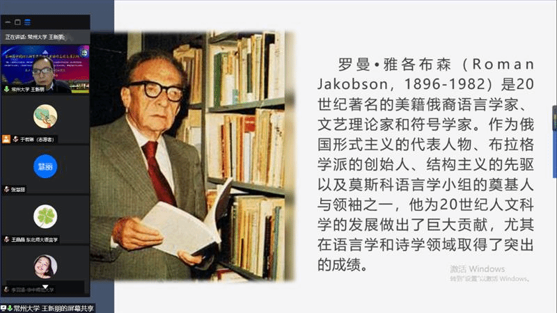 常州大学的王新朋副教授作了题为“雅各布森言语交际理论的符号学解读”的主旨发言。王新朋副教授对言语交际六因素展开了当代文化语境下的拓展和应用研究,从而使得这一语言学模式成为符号学模式,并将其应用范围从语言学领域拓展到社会文化的大范畴,对当代文化现状中的一些典型特征进行了理论阐释。