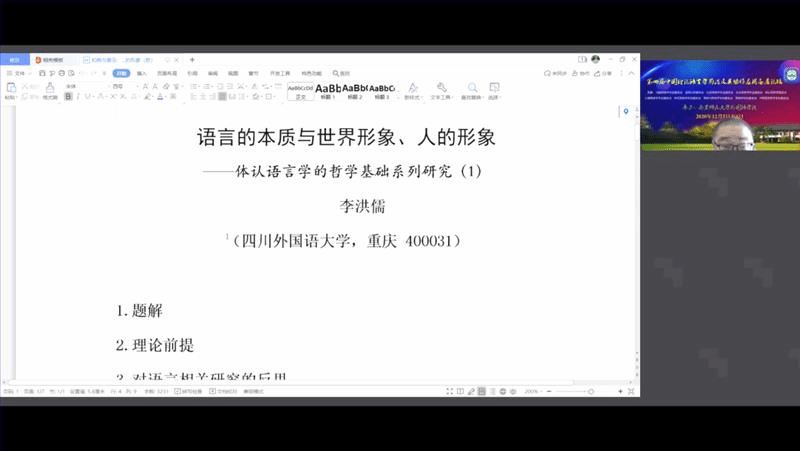 四川外国语大学的李洪儒教授作了题为“语言的本质与世界形象、人的形象——体认语言学的哲学基础系列研究”的主旨发言。李洪儒教授提出了体认语言学的核心原则和语言的本质。他认为区分知晓概念和意义概念是认识论的核心问题。李教授提出,体认语言学的哲学基础应该是一切既揭示世界揭示人又揭示两者辩证关系的现有哲学学派所包含的合理且相关的成分。