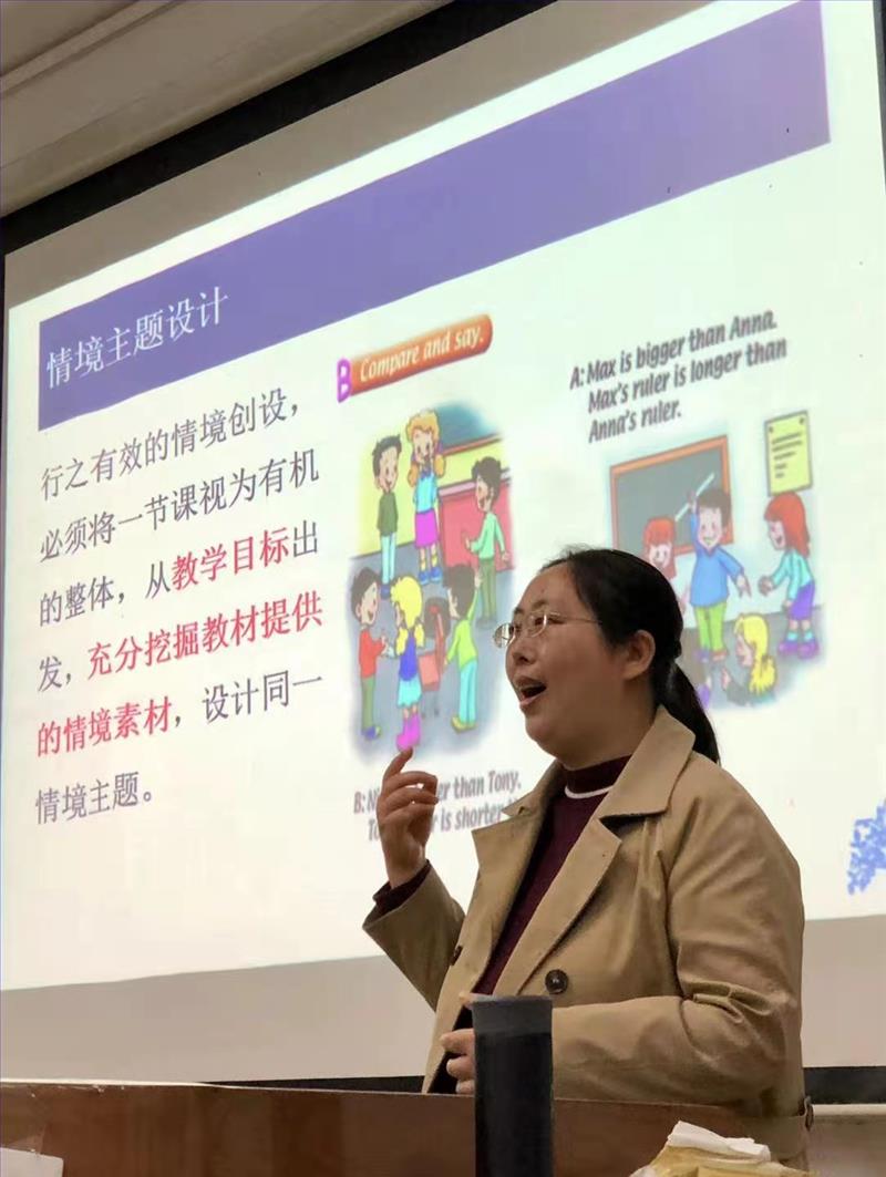 曹洪霞老师分“新知呈现”、“语言练习”和“新知运用”三个不同的教学阶段,通过生动的教学实例,呈现并分析讲解了基于真实情境的课堂教学活动的完整设计过程。曹洪霞老师指出,在创设情境时,一定要“从教学目标出发,充分挖掘教材提供的情境素材,设计同一情境主题”;同时,要注意“不要让课堂过于娱乐化”,要将知识点融入游戏,重视教学成果,注意对学生价值观的引导。