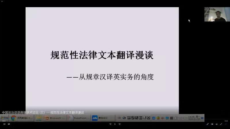 讲座伊始,叶正茂从法律规章的汉译英角度来跟听众做自己的分享。首先,他跟大家介绍了“特殊用途语言(LSP)”,并指出:法律翻译的过程常常分为三部分:理解、表达、审校,这三部分往往都不是一次能完成的,是反反复复的,不断经过验证。随后,他用不同的例子分别向听众介绍了立法语言的特点。接下来,他又向我们介绍了规范性法律文本翻译的原则:准确性、一致性、简洁性,并指出:在法律文本中通过专业的术语、句式来表达法律的规范。同时,叶正茂还向听众介绍了规范性法律文本中的句式。