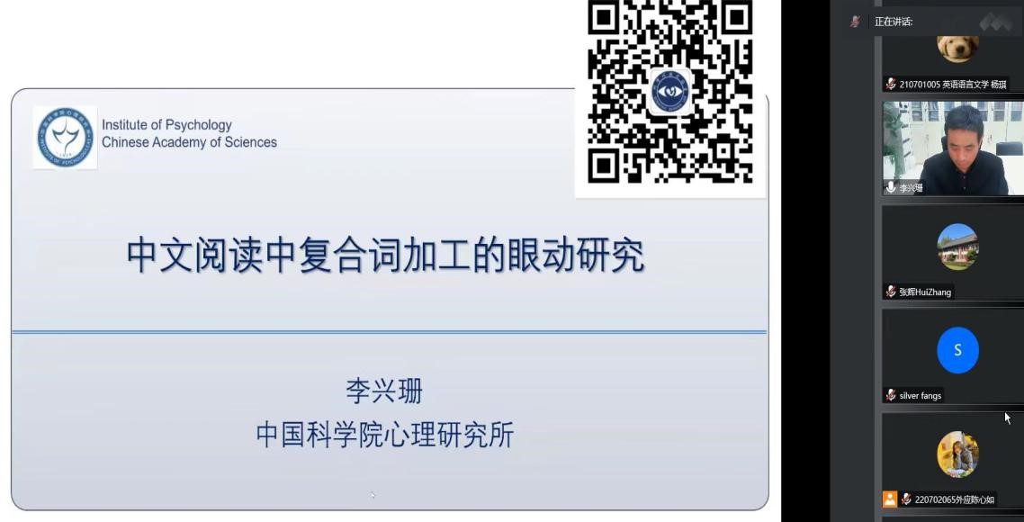 10月13日晚,“百廿南师·外语名家讲坛”系列讲座在腾讯会议云端开讲,中国科学院心理研究所研究员,中科院“百人计划”入选者李兴珊教授以《中文句子阅读中复合词加工的眼动研究》为题,为南师大外语学院和其他大学的师生300余名师生带来了内容丰富的精彩演讲。本讲座受到了南京师范大学“十四五”重点学科(交叉学科)“语言认知科学与艺术”的资助。