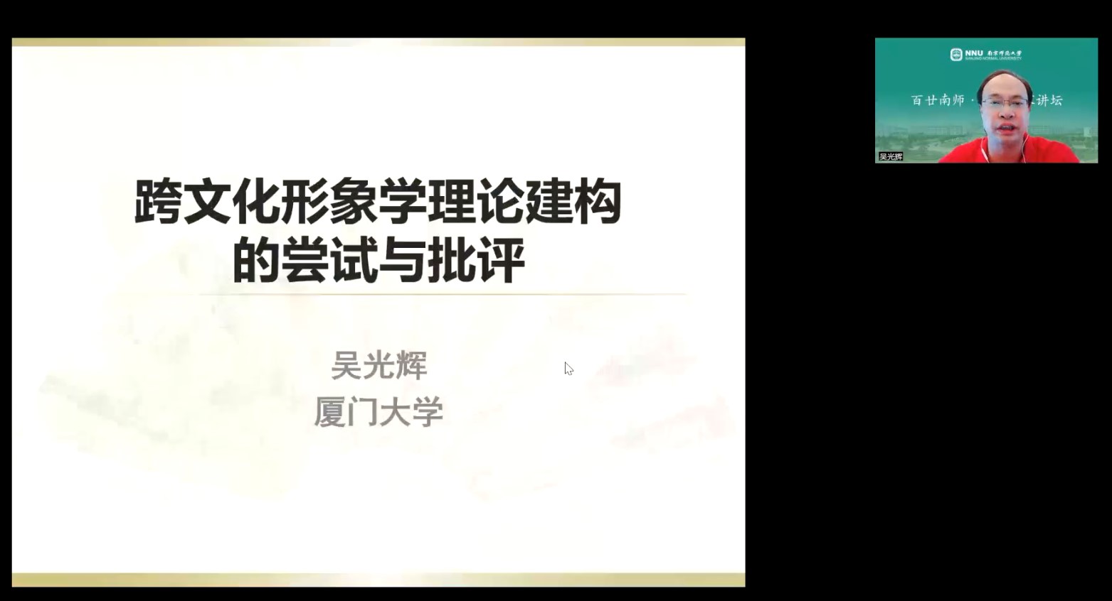 清秋恰逢梧桐雨,金陵鹭岛亦比邻。10月6日,百廿南师校庆之际,外语名家讲坛有幸邀请到了吴光辉教授,以“跨文化形象学的理论建构”为题,为我们解明究竟何为“中国形象”,并就跨文化形象学的本质展开研讨与批评。吴光辉教授系厦门大学外文学院教授、博士生导师,担任教育部日语教学指导委员会委员、中华日本哲学会副会长、中华日本研究会常任理事、中国日语教学研究会华南分会副会长等职,有著作十余部,发表学术论文一百六十余篇。本次讲座由南京师范大学东方研究中心主任、日语系主任林敏洁教授主持。师生们饱含求知热情,齐聚云端,讲座在开始前已达人数上限,可谓“一位难求”,共有三百余名师生以线上线下相结合的方式一同聆听了本场讲座。