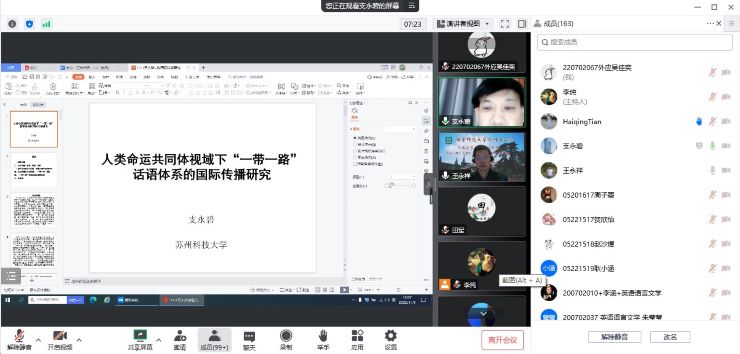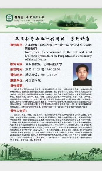 11月3日晚,依托王永祥教授的国际横向课题欧亚财团项目,“文化符号和亚洲共同体”系列讲座第五讲在云端开讲。苏州科技大学国外智库涉华舆情分析研究中心主任、城市发展智库副院长支永碧教授以“人类命运共同体视域下‘一带一路’话语体系的国际传播研究”为题,从“人类命运共同体”理念和“一带一路”倡议的提出背景出发,阐述了全球治理的困境、挑战和期待,并分析如何在“人类命运共同体”理念的引领下有效建构和传播“一带一路”对外话语体系。本场讲座由博彩网址大全-博彩网址
