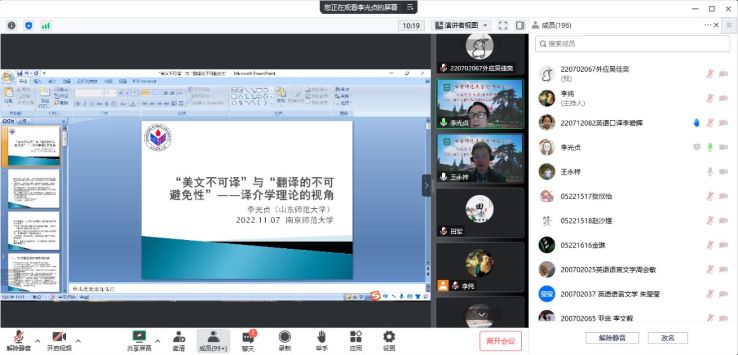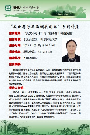 11月7日晚,依托王永祥教授的国际横向课题欧亚财团项目,“文化符号和亚洲共同体”系列讲座第六讲在云端开讲。山东师范大学国家级一流本科专业(日语)建设点负责人、山东与东亚区域日语文献研究中心主任李光贞教授以“‘美文不可译’与‘翻译的不可避免性’”为题,结合自身参与的研究项目和审译工作的丰富经历,通过多部中文名著译文的例证,层层递进、形象生动地阐述了文学翻译的创造性特质、翻译的不可避免性以及翻译损失的不可避免性。本场讲座由博彩网址大全-博彩网址
