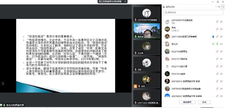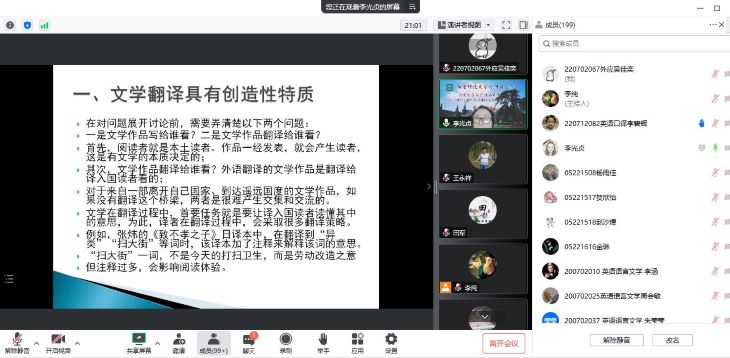 王永祥教授对本场讲座进行了精彩点评。田军老师结合讲座内容也谈了自己的看法和感悟,并邀请李光贞教授就“译者在‘讲好中国故事、传播好中国声音’的翻译实践中,应该具备哪些基本素养”以及 “如何更好地理解源文本”等方面,为外院学子提出指导性意见和建议。李教授结合结合自身的学习和研究经历,给参会师生提供了极具借鉴意义和参考价值的指导。随后,李教授又与其他参会师生进行了热烈的交流和讨论。