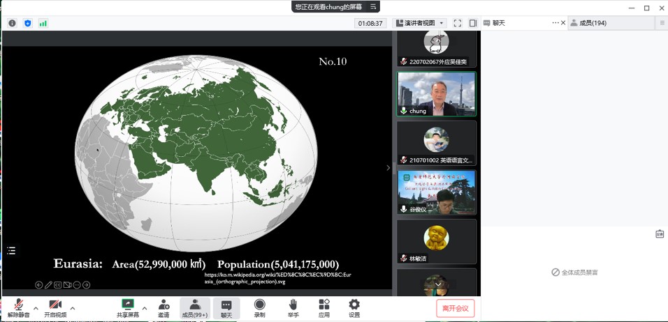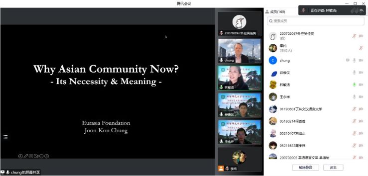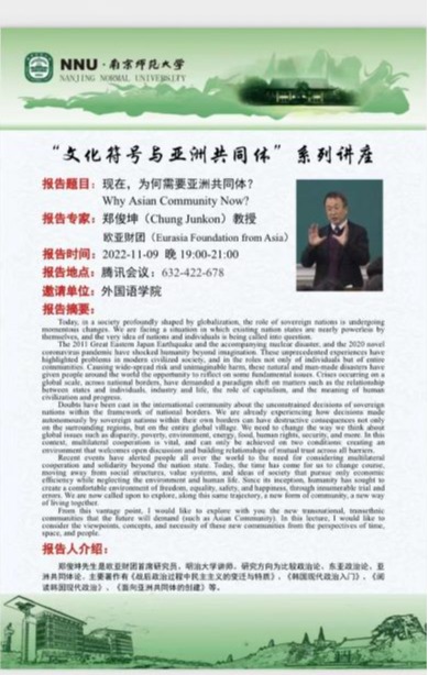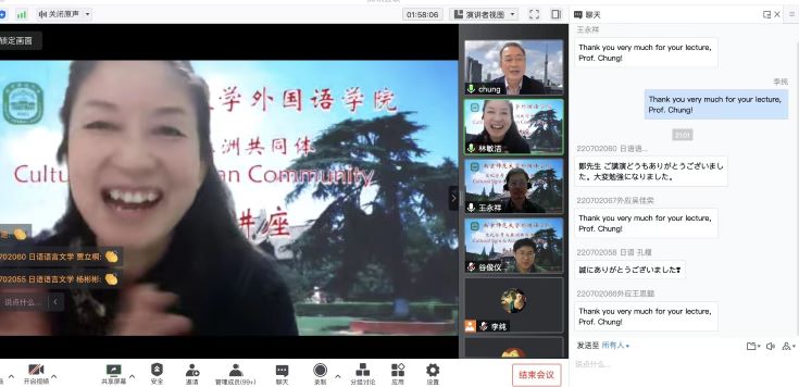 11月9日晚,依托王永祥教授的国际横向课题欧亚财团项目,“文化符号和亚洲共同体”系列讲座第七讲在云端开讲。欧亚财团首席研究员、明治大学讲师郑俊坤教授以“现在,为何需要亚洲共同体?”为题,结合自己多年来研究的有关亚洲共同体的理论,从时间、空间和人间三个维度辩证地探讨了亚洲共同体的概念和必要性这一重要课题,并提供了一种构建新共同体的方法论思路。本场讲座由南京师范大学东方研究中心主任林敏洁教授主持,谷俊仪老师担任翻译,两百余名校内外师生集聚云端聆听讲座。