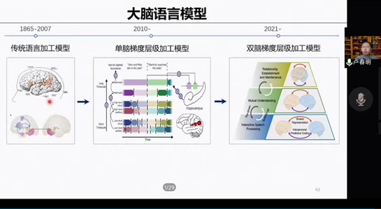 讲座第三部分,卢春明教授介绍了近红外超扫描技术在自然语言交际领域的应用情况。双人或多人间的语言互动行为伴随着脑间神经活动的同步,超扫描技术能够记录并分析这种脑间神经同步,为互动行为的模式、质量等方面提供依据。卢春明教授通过介绍其团队近年开展的一系列超扫描研究,重点解释了语言的双脑梯度层级加工模型。双脑梯度层级加工模型包含了自上而下和自下而上的加工过程。第一梯度为互动语言加工,涉及多通道的信息整合,以双脑间共享的神经表征和人际预测编码为主,例如有研究发现视觉信息对语音交互有显著的促进作用;第二梯度为相互理解,如语义、句法信息在交互双方的大脑中的共同表征;第三梯度为人际关系的确立与维护,这一梯度充分考虑了语言交流在建立社会联结、构建社会关系等方面的作用,也是以往的语言模型所缺乏的,具有前瞻性和创新性。