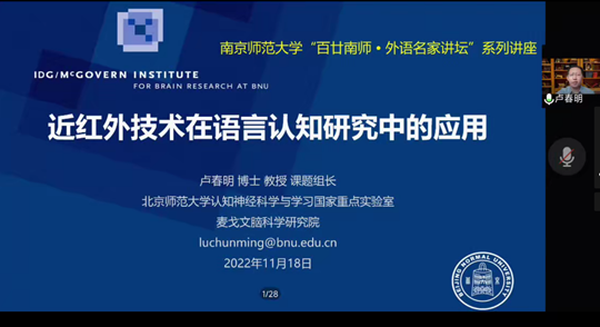 11月18日上午,“百廿南师·外语名家讲坛”系列讲座有幸请到北京师范大学认知神经科学与学习国家重点实验室教授,麦戈文脑科学研究院副院长,课题组长,博士生导师卢春明教授,为我们展开以“近红外技术在语言认知研究中的应用”为题的云端讲座,结合近红外技术的特点、在语言研究中的重要性等,卢教授介绍了一系列应用该项技术探索自然语言加工和自然语言交流的研究,并展望了未来的发展趋势。本次讲座由南京师范大学教授、博士生导师徐晓东教授主持。