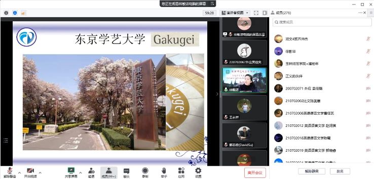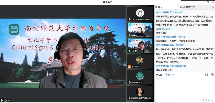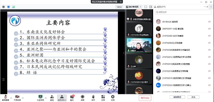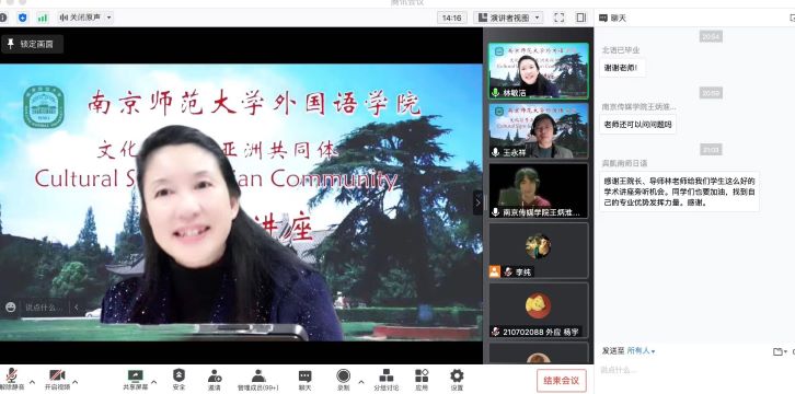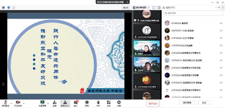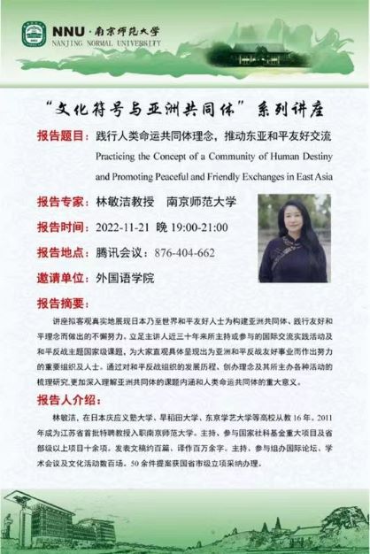 1121日晚,依托王永祥教授的国际横向课题欧亚财团项目,文化符号和亚洲共同体系列讲座第十讲在云端开讲。博彩网址大全-博彩网址 东方研究中心主任林敏洁教授以践行人类命运共同体理念,推动东亚和平友好交流为题,从自身主持的和平反战主题国家级课题和参加的国际交流实践活动经历出发,为大家客观、生动地展现了日本乃至世界和平友好人士为构建亚洲共同体、践行友好和平理念而做出的不懈努力。本场讲座由博彩网址大全-博彩网址 院长王永祥教授主持,近三百名校内外师生集聚云端聆听讲座。