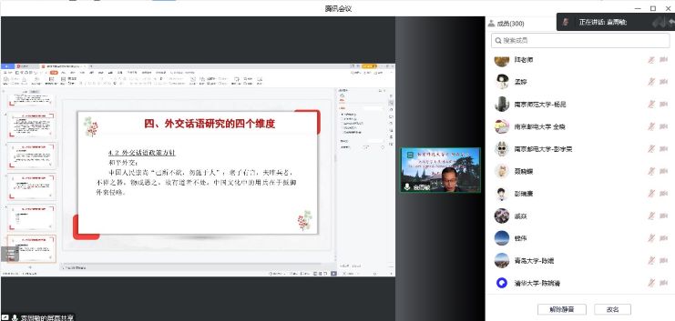 讲座伊始,袁周敏教授对外交话语研究做了述评,主要从国际关系与国际政治、翻译与传播、语言学三条路径介绍了外交话语的研究重点、内容及原则。袁教授指出,以往的研究多从外交话语政策、国际政治与国际关系视野中的外交原则以及主要国家的外交关系出发,缺乏外交话语理念到外交话语政策、进而落地到外交话语的语言生成与传译的过程化视角。鉴于此,他在研究中采用文化话语理论的视角,考察中国外交话语并论证中国外交话语一惯的“和”文化特性,从而消解国际社会对中国外交实践的误解甚至扭曲。