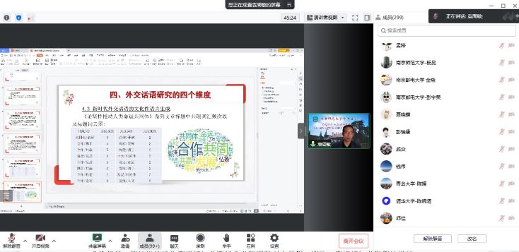 袁教授引用我国多位领导人的发言,阐述了外交话语理念。他认为,和平与发展始终是中国外交话语理念的关键词,浸润在中华民族的文化基因中,贯穿到中国外交话语理念的根系里,同时渗透在国民性与民族性之中。袁教授引用党的十五大至十九大的报告主题来阐释“和平、合作、发展”的外交话语方针。他认为,“和”是中国文化中一以贯之之道,也是中国人精神的生命之道,中国外交话语奉行尊重与维护世界多样性的政策,共同促进人类文明繁荣进步,促进“和而不同”的文明样态。