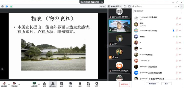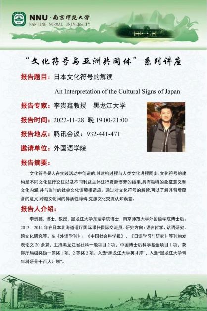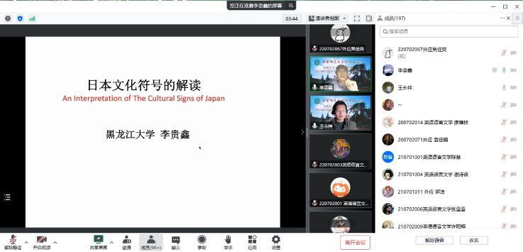 11月28日晚,依托王永祥教授的国际横向课题欧亚财团项目,“文化符号和亚洲共同体”系列讲座第十二讲在云端开讲。黑龙江大学东语学院李贵鑫教授以“日本文化符号的解读”为题,结合日本传统节日、典型景观等实例,从文化符号的基本特征、日本文化的基本特征、日本文化符号的构建以及启示四个方面,以多模态的方式形象生动地展现了日本文化符号的内涵与意义。本场讲座由博彩网址大全-博彩网址
