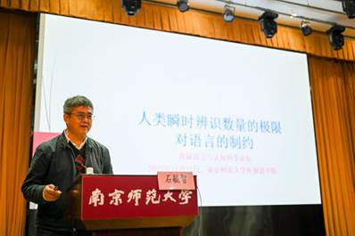 新加坡国立大学石毓智教授做了题为“人类瞬时辨识数量的极限对语言的制约”的主旨报告。石教授从语言的书写系统、语音表达和范畴化这三个角度,论证了人类语言的符号普遍存在着数目“4”的上限。