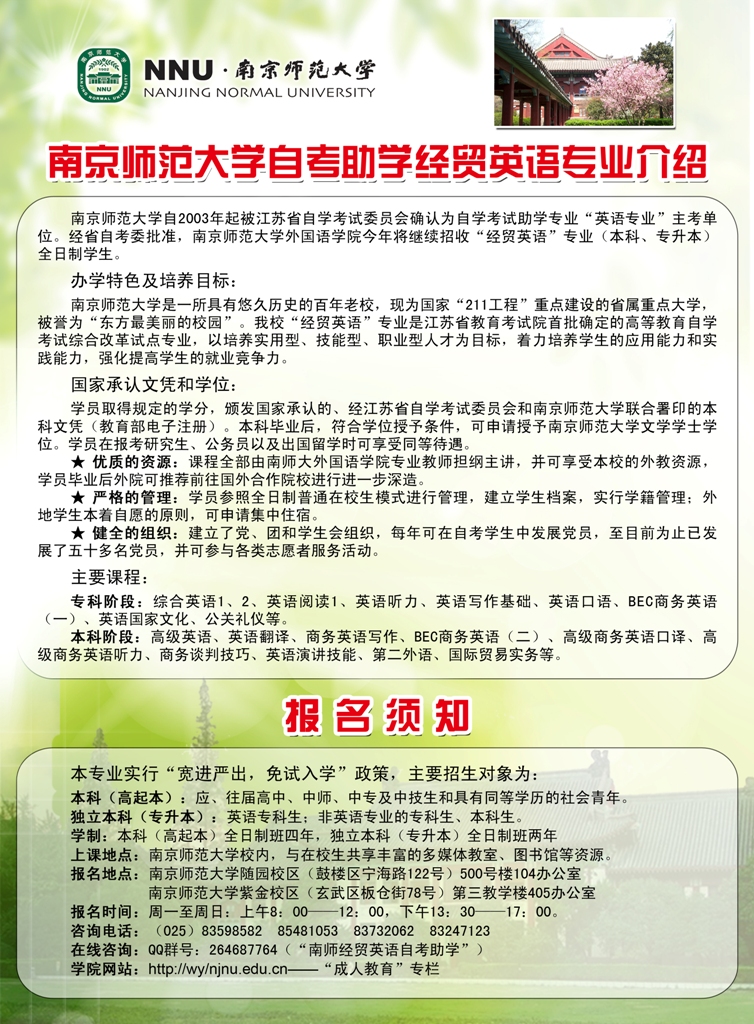 南京师范大学是一所具有悠久历史的百年老校,现为国家“211工程”重点建设的省属重点大学,被誉为“东方最美丽的校园”。我校“经贸英语”专业是江苏省教育考试院首批确定的高等教育自学考试综合改革试点专业,以培养实用型、技能型、职业型人才为目标,着力培养学生的应用能力和实践能力,强化提高学生的就业竞争力。