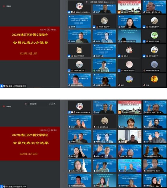 2022年11月19日上午,江苏省外国文学学会会员代表大会暨换届选举大会、第九届理事会第一次全体会议通过腾讯会议在线上举行,220余位会员代表参加了本次换届会议,会议由会长杨金才教授主持。