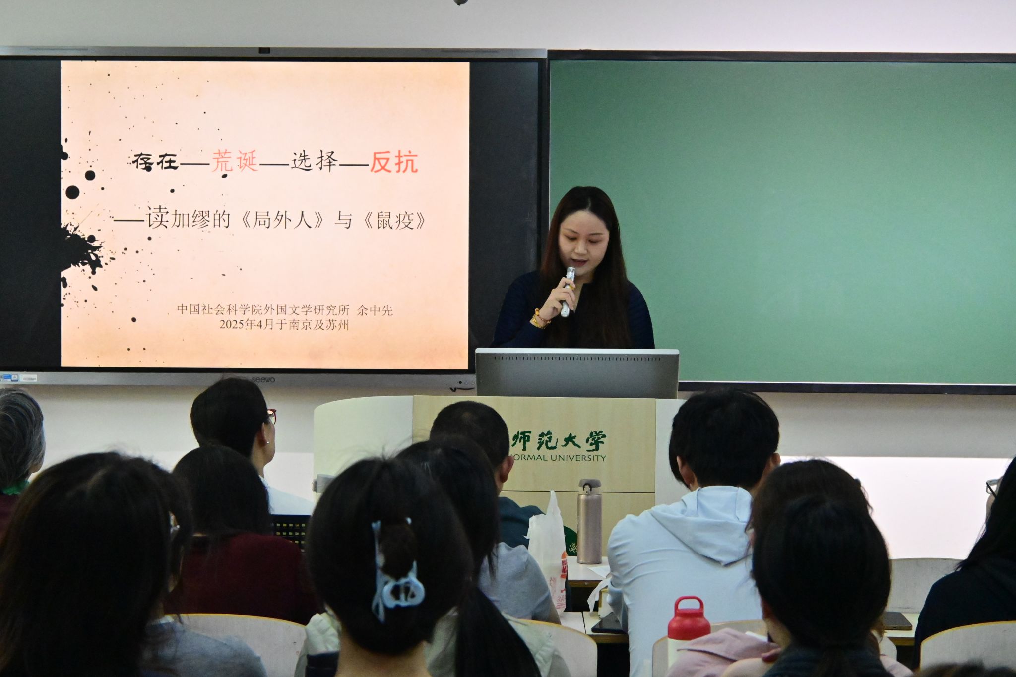 法语系特邀中国社会科学院外国文学研究所研究员、《世界文学》前主编、资深翻译家余中先教授,于仙林校区举办题为《从“荒诞”到“反抗”——我对加缪作品的解读》的学术讲座。这场学术盛宴吸引了众多师生积极参与,现场座无虚席。本次讲座由法语系副主任王明睿副教授主持,系主任陈沁副教授代表全系致欢迎辞。