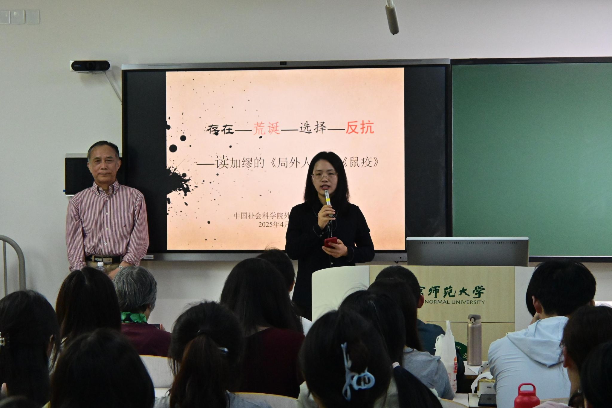 余中先教授巧妙援引法国著名作家加缪代表作中法庭审判的场景,将讲座现场与文学情境相联结,引领听众迅速沉浸于其笔下的荒诞世界。讲座中,余教授系统性梳理了加缪哲学思想的核心脉络——从“认识荒诞”到“选择反抗”,将其作品划分为两大系列:“荒诞系列”和“反抗系列”。通过对题目、人物、情节、文风等多方面的分析,余教授详细阐述了这两个主题的内涵。一方面,他深入剖析了法语“局外人”一词的三重内涵,揭示世界本身以及人存在于此的荒谬境地;另一方面,他邀请学生朗读经典片段,通过对比不同译本,以沉浸式体验凸显“局外人”的哲学意蕴。随后,余教授以二战背景下的书写隐喻为切入点,解读不同人物的反抗姿态,围绕“为什么要反抗”“我反抗,我存在”“忠实于反抗本身”三个核心问题,深入探讨了加缪对荒诞世界的积极反抗思想。在此过程中,加缪的哲学思想经历了从个体觉醒到群体抗争的深刻转变。讲座尾声,余中先教授以精炼而深刻的语言勾勒出加缪思想演进的轨迹:当主体对自身的荒诞处境有所意识后就会选择行动来进行反抗,而加缪主张的反抗形式是具有人道主义精神的。
