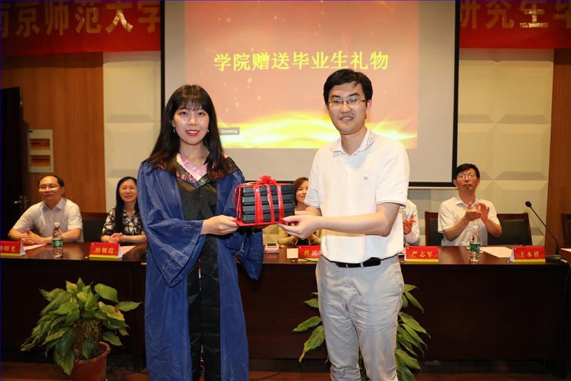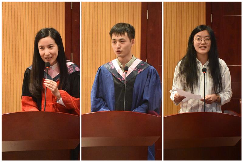 随后,毕业生代表依次发言。首先是博士生代表曹晓娇同学发言。她回顾了自己从有着七年工作经历的在职人员转变为博士研究生的学术之路,并总结了两点做学问的经验与感受——做好计划,克服困难;享受生活,保持身心健康。其次是硕士生代表段秋炯同学发言。他分享了自己在翻译实践中的趣事,也为南师翻硕学子跨越大半个中国、涉及各个领域的实践而感到自豪,并通过离开青春校园的不舍,表达了斗志昂扬的人生态度。最后是在校生代表姜亚君同学发言,她代表全体在校生向毕业的师兄师姐传达了由来已久的仰慕之情,也对自己的学习划定了清晰的努力方向,并祝福毕业生们今后书写一段全新的人生篇章。