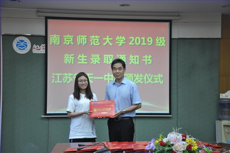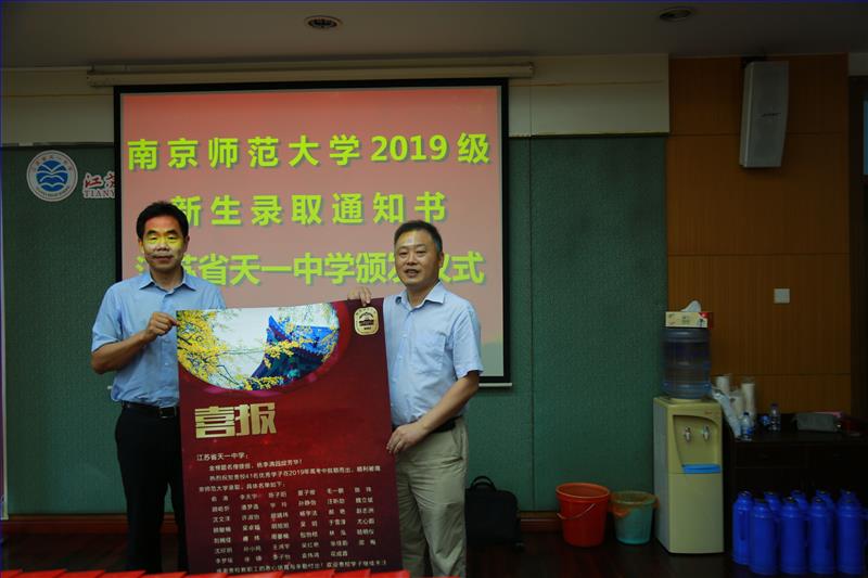 校长办公室主任陈中建老师宣读了南京师范大学2019年在天一中学录取的41名学生名单及录取专业。接着,陈国祥校长赠送天一中学录取41名优秀学子的喜报,并一一为这41名优秀学子颁发录取通知书。