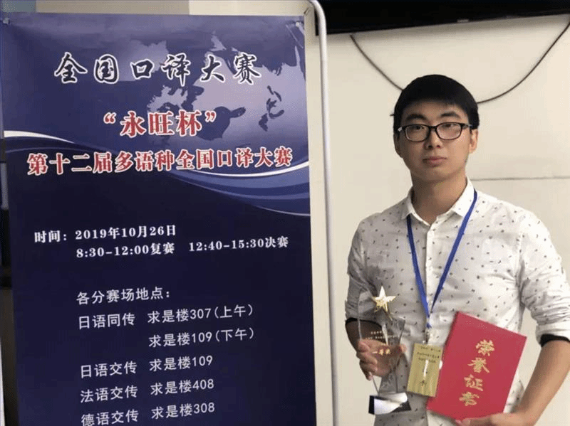 15级西英双语班朱致辰同学在西班牙语交传组比赛中表现优异,在参赛的本科生和研究生选手中脱颖而出,获得全国第一名的好成绩。