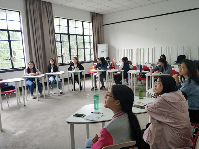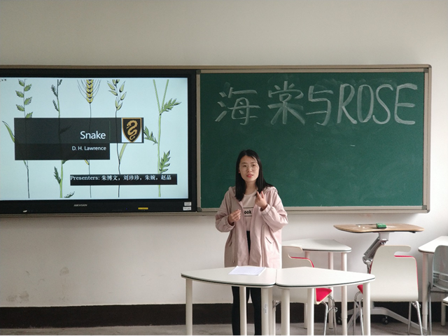 在团队展示中,王淑云和杨芷君分享了经典歌曲Vincent Van Gogh,从不同时期分析了梵高的作品风格;赵承运简要介绍了I’m Nobody的写作背景,接着由齐志华、刘欣怡和龙宇演绎了精彩的情景短剧,再现狄金森的诗歌内涵;赵晶着重分析了Snake在劳伦斯笔下的象征意义,并与听众展开讨论。团队展示在热烈的掌声中告一段落。接下来在个人展示中,韩婧婧分享了两首诗歌——《返祖》和《船》,论证了“何为胸怀”这一宏大的主题;董文举从“海棠”出发,经由《午窗偶成》,介绍了海棠的不同种类;朱宏丽结合自身经历,重新解读了顾城的《远和近》,并表达了自己在生活中积极向上的精神态度;姜亚君从写作背景赏析海子的《太阳和野花》,并提出“诗不是用来学的”这一观点,得到同学们的支持。