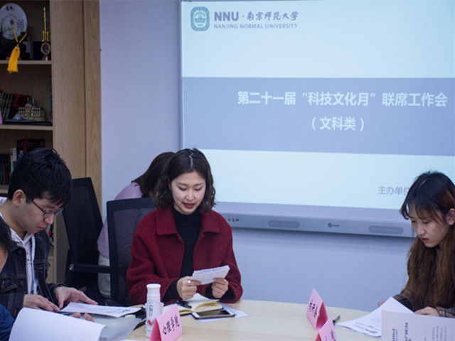 研究生会牵头的第二十一届科技文化月联席工作会(文科类)在随园校区500号楼诺文图书馆成功举行。出席会议的主要人员有:校研会副主席朱瑶、心理学院主席茆家焱、社会发展学院主席谢吟龙、文学院主席杨阳、金女院主席王鹏宇、教师教育学院主席朱越、教育科学学院副主席刘芳、博彩网址大全