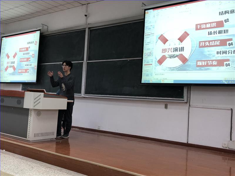 讲座中,王一宇学长从多次备战英语演讲的校赛、省赛、国赛讲起,分别在学科竞赛的赛前准备、比赛技巧、评判标准、平时积累等诸多方面与新生们分享经验。他还进一步拓展,“英语演讲与英语写作,事实上是相辅相成的”,“逻辑结构的搭建、开头的巧妙设计、观点深挖或以叙带理的模式选择等等,都是优秀的演讲者与写作者需具备的”。