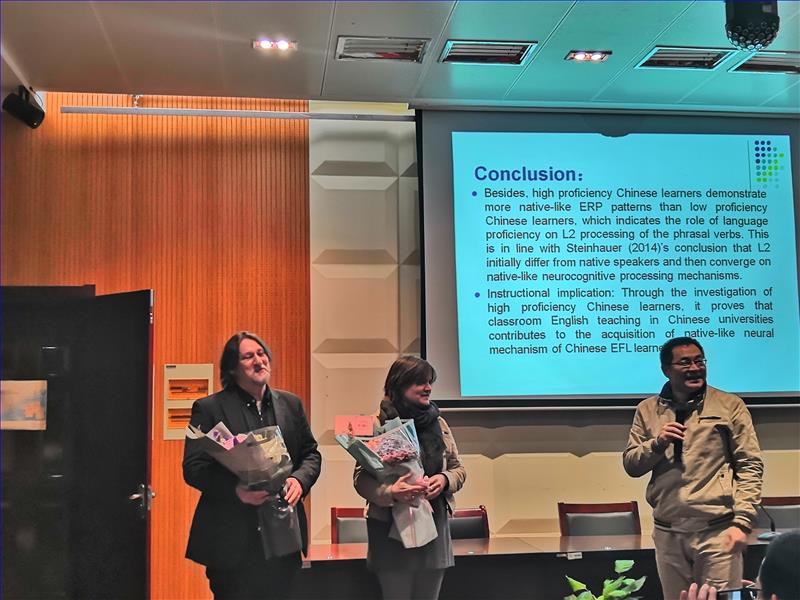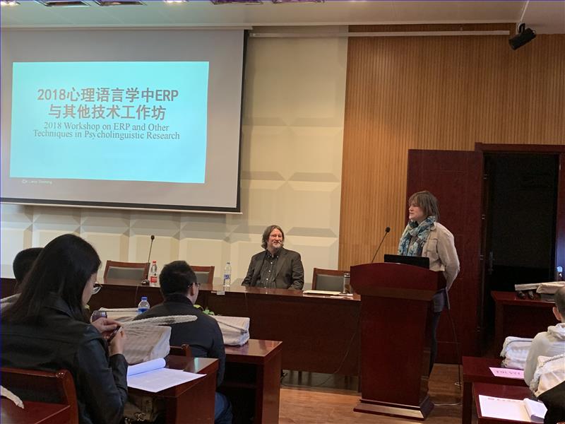 的概况以及近些年在神经语言学方面所取得的长足发展,并预祝此次工作坊圆满成功。在随后的主题发言中,Karsten Steinhauer 教授对大脑信号的神经生物学基础进行了介绍,指出了脑电波(EEG)是在大脑活动时,大量椎体细胞顶端树突的突触后电位通过总和形成的电位,而事件相关电位(ERPs)则是通过脑电波叠加所形成的反应特定事件加工的即时电压变化。下午,Phaedra Royle教授介绍了母语和二语研究中的一些基本脑电成分。首先,Phaedra教授对脑电成分的命名规范和特征进行了说明,其次介绍了语言加工中的一些典型脑电成分,包括反应词汇和语义加工的N400,反应形态句法加工的LAN,以及反应句法整合过程的P600等。