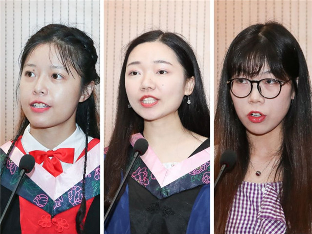 随后,毕业生代表发言。首先是博士生代表王瑞瑒同学发言,她分享了自己的两点感悟:嚼得菜根,做得大事。对学术的坚持、严谨和执着才是践行学术之根本;用最初的心,做永远的事。这是我们所有南师大外院人坚守的理念。然后是硕士生代表秦沁同学,她说在南师做论文的途中所培养出的能力是受益终生的。最后是在校生代表冯婷婷同学发言,她代表全体在校生向毕业的学长学姐们表达了热烈的祝贺和深切的祝福,祝福他们在今后开启一段段精彩的人生旅程。