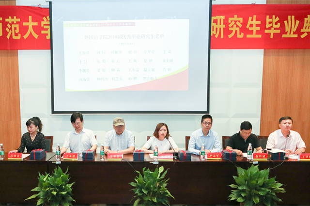 党委书记蒋其琴老师,院长严志军老师,副院长吴亦东、倪传斌、王永祥老师,院学位委员会主任辛斌老师,研究生教研室主任吕洪灵老师,俄语系主任管月娥老师,辅导员和即将踏上新征程的毕业生们。本次毕业典礼由学院党委副书记王洪波老师主持。