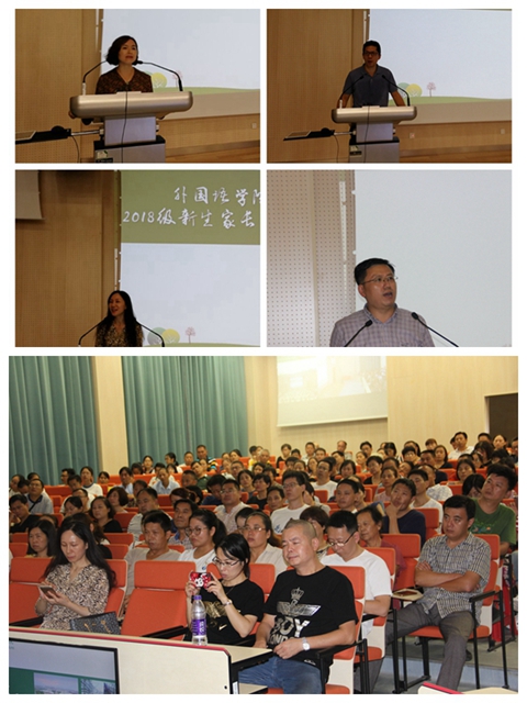 双外语教学在学科、就业等方面的优势,向新生家长展现了本学院的独特风采。然后,分管本科生教育的田朝霞副院长具体介绍了本科生培养方式,从学院教育,出国交流以及继续深造三方面阐述了不同阶段的不同挑战和机遇,并强调学院会尽可能多得为学生提供出国的机会,让学生有机会接触到目标语种国家的当地文化。会议最后,王洪波副书记运用几个生动形象的例子强调了新生身心健康、财产安全问题。大会结束后,仍有许多家长驻足会议厅向各位老师询问学生学业相关问题,老师们也耐心地一一给予详细解答,实现了教师与家长的“零距离”沟通。